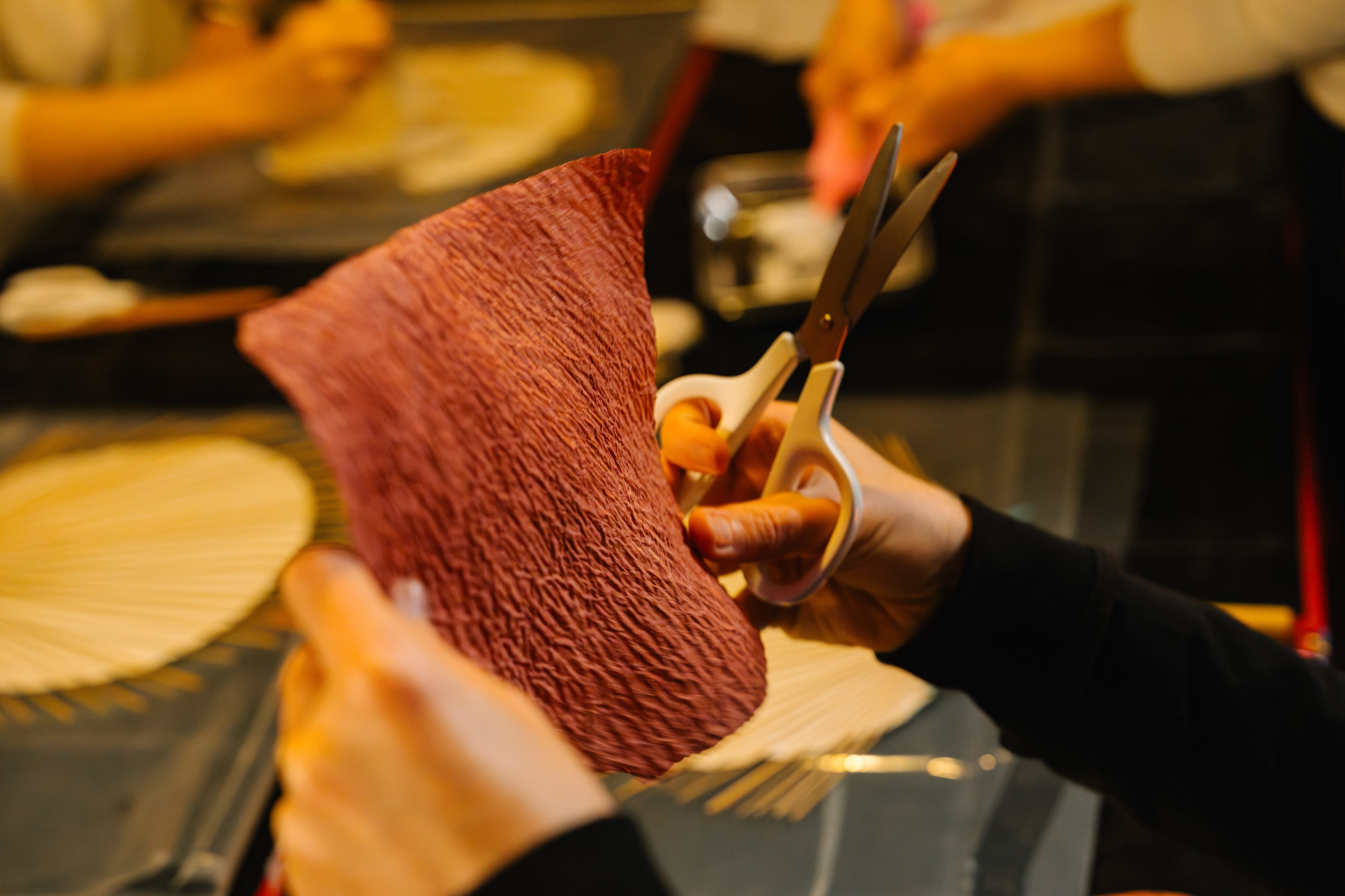 ⼀度は途絶えたものの、近年、職⼈の⼿によってその技術が甦り、再び注⽬を集めています。体験では、職⼈が⾃ら擬⾰紙の歴史や製法を解説し、参加者は実際に和紙の加工に挑戦。